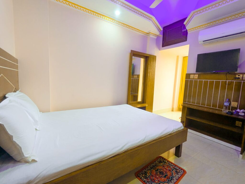 An affordable choice for couples seeking comfort on a budget. This AC Deluxe room features a double bed with fresh linens, essential furnishings, and a private bathroom, ensuring a simple and pleasant stay without compromising on cleanliness or convenience.